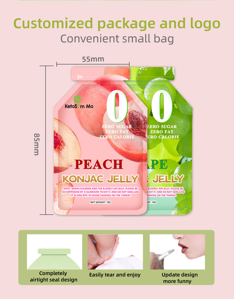 The packaging of konjac jelly products plays an important role in attracting customers. Ketoslim Mo can choose visually appealing containers for you, such as cups, pouches or jars, and design your packaging and logo for free. Convenient packaging for easy consumption and portability will enhance the overall customer experience.
